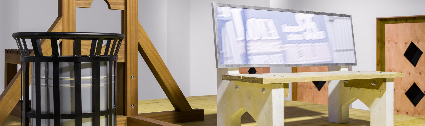 The guillotine that haunts this otherwise prosaic scene is made from smooth, expensive walnut. A historical signifier of rebellion, terror and regime change, the guillotine was a mode of execution wielded against all social classes – most famously as the tool of the leaders of the French Revolution (1789–99), many of whom were themselves ultimately beheaded by it. However, in common with many theatrical props, the functionality of Stingily’s guillotine is illusory: its blade runs along the same track as the pillory, so if it were dropped it would hit the top of the wooden collar, not slice through a neck.