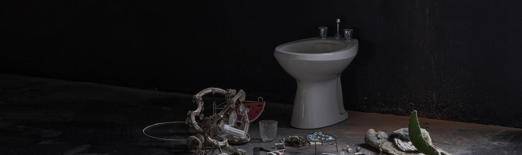 Main image: Tolia Astakhishvili, universe (detail), 2025, washing hanger from demolished bathroom, found objects Water Tank, toilet, found objects, murano glass, dimensions variable. Courtesy: the artist
